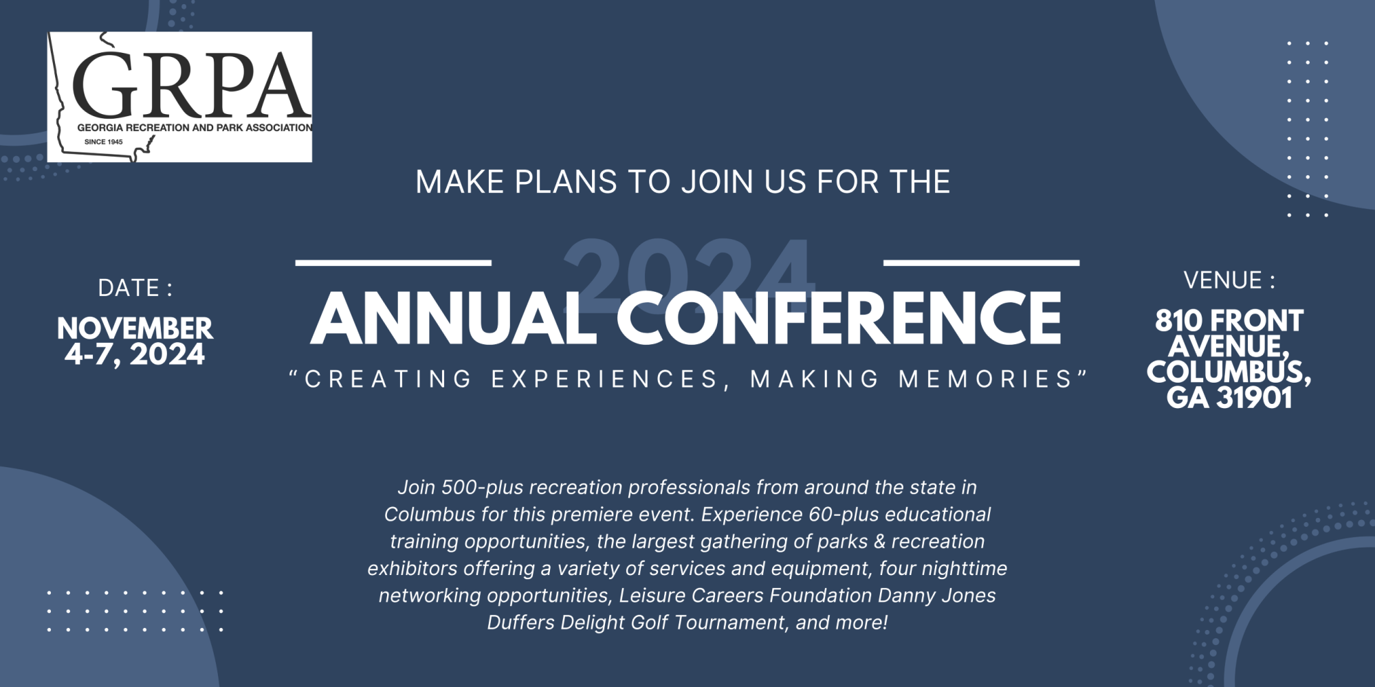 Join 500-plus recreation professionals from around the state in Columbus November 4-7 for this premiere event. Experience 60-plus educational training opportunities, the largest gathering of parks & recreation exhibitors offering a variety of services and equipment, four nighttime networking opportunities, Leisure Careers Foundation Danny Jones Duffers Delight Golf Tournament, and more!
